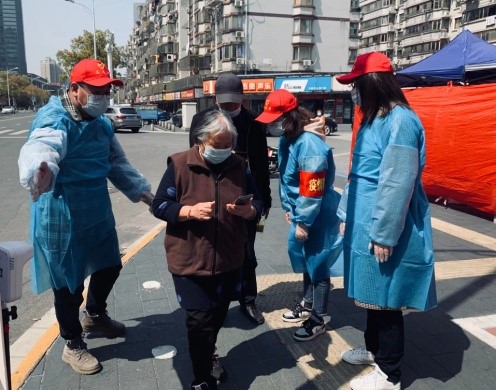 在區(qū)進(jìn)行的四輪全員核酸檢測的組織現(xiàn)場,志愿者們換上藍(lán)色防護(hù)衣,戴好防護(hù)面板,套上紅色防疫袖套,根據(jù)安排分工配合:有進(jìn)行信息核查步驟的,在進(jìn)口處測量體溫、查驗(yàn)健康碼、行程碼,指導(dǎo)幫助老人操作手機(jī)、協(xié)助居民注冊核酸采樣碼,問詢疫苗接種情況;有在隊(duì)伍旁維持現(xiàn)場秩序,引導(dǎo)群眾保持安全距離的;有積極進(jìn)行疫情防控知識(shí)宣傳工作的,推廣便民的場所碼、好通碼,宣講疫苗接種……有力促進(jìn)了全員核酸檢測工作有序、高效、安全開展。
